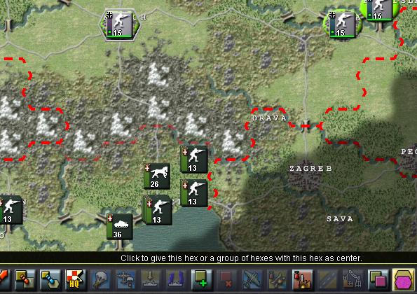 Germany is allied with Italy (once awake) and the West is allied with China and the US once the West is at war with Japan. In the picture below, you can see the border between Italy and Germany. Note that it is faded relative to the other borders nearby. This indicates that the countries are allies. Note the the alliance between Italy and Germany does not start until Italy is awake so you will see the unallied border when the scenario starts. Allies can share recon. R&D sharing is turned off thought Italy gets German tactical R&D and the US and the West's tactical R&D is synced. Selecting the pink hexagonal line in the lower right hand corner of the picture below allows a regime to give hexes to an ally. Germany might consider giving a resource or chemical factory hex to Italy. Also note that allies can move and draw supply through eachother's territory. Finally, the pink box bottom in the lower right hand corner allows allies to give units to allies (this is turned off during China's turn). Allies can also strategically transfer units or supplies to each other.