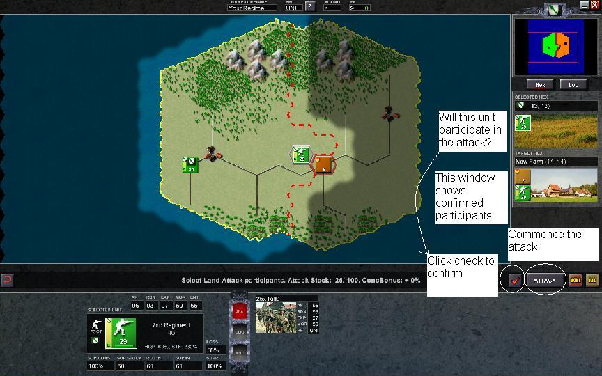 We have indicated the target of our attack. Now select regiment 2. To confirm that this formation with participate in the attack, click the confirmation check in the button menu. If we had other formations next to our target hex, we could add them to the attack by selecting them and confirming. Regiment 2 should now appear in the target window with the targeted enemy unit. When you are ready to attack, hit the “Attack” confirmation (next to the check).