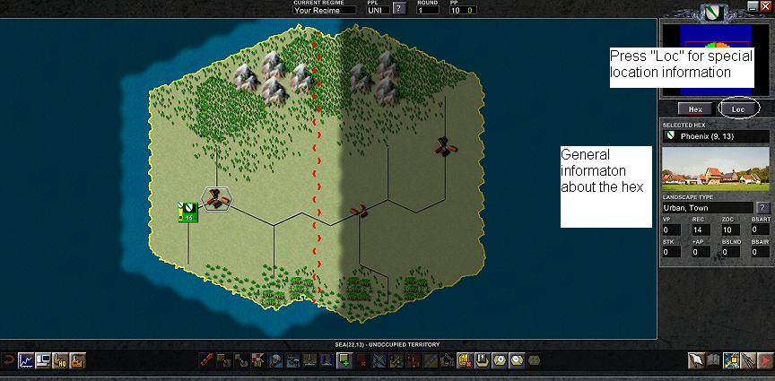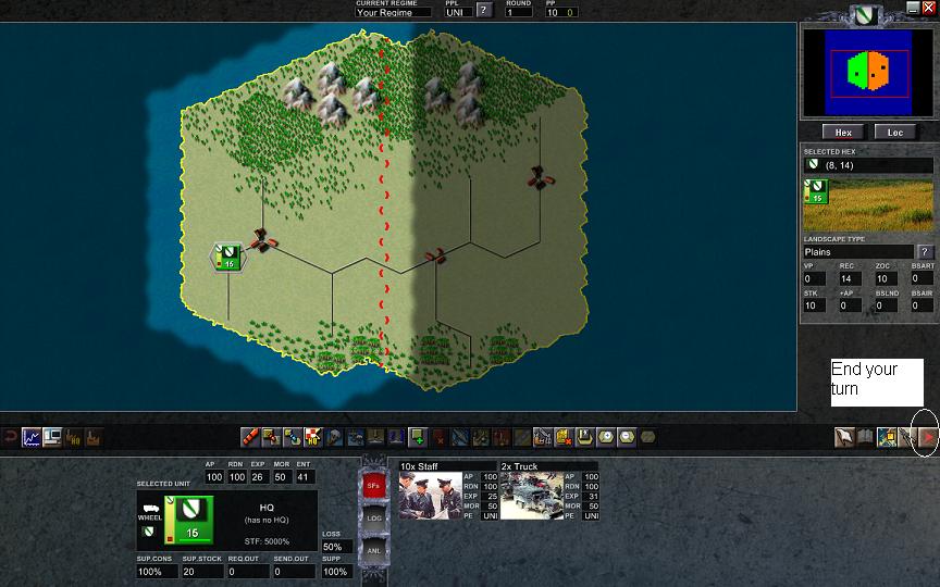 Next we will create an infantry unit near the front line. Select the road hex just before the enemy territory. Now click the “New Unit” button (green square with a ”+” sign near the middle of the line of buttons).