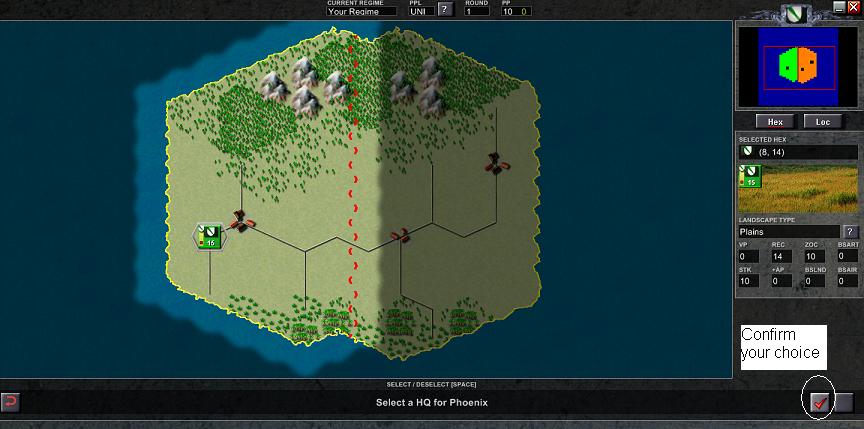 You are given the choice of creating a formation (cost is 1 PP) or a HQ (cost is 5 PP). PPs are political points, an abstract social cost of maintaining the military. PPs can be created by most prodution centers. They are used to create units and do research. At the top of the screen is a running talley of your political points (you have 10). Creating HQs are expensive in terms of PPs but useful on large maps. We will start making a formation for the HQ we already have. Click the “Formation” button and a formation box should appear in the chosen hex.