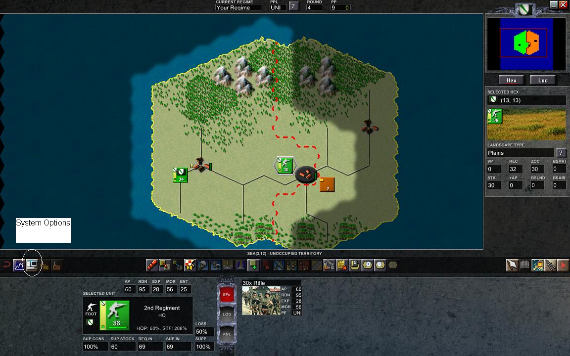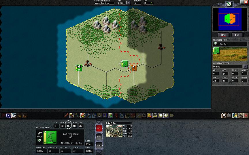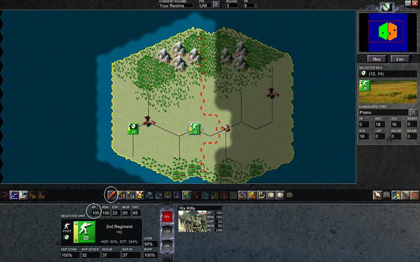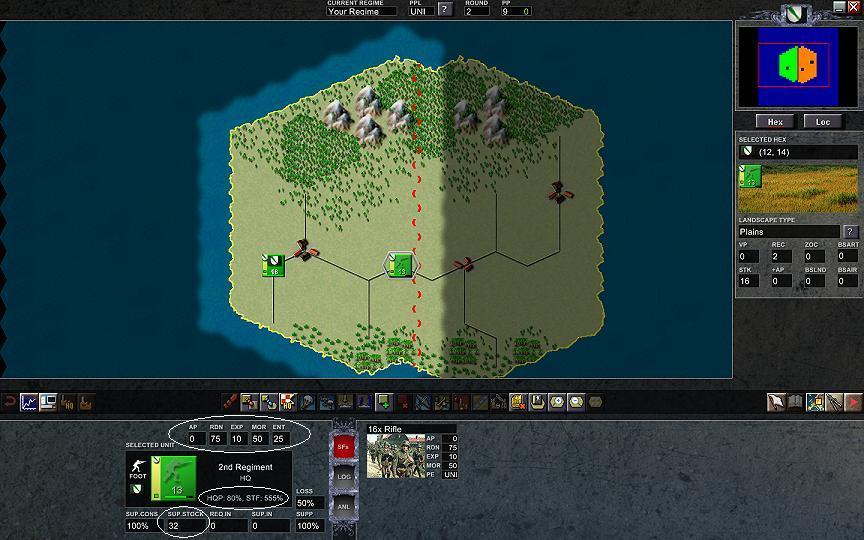Let's look at our unit (select regiment 2). All these numbers mean something, we will start at the top. AP are action points. They determine how many actions (moving, attacking, etc) the formation can make. Since the formation was made this turn, it has no actions left. RDN is readiness. It is a measure of how organized the formation is. Since everyone just arrived this turn, they are not 100% organized. EXP is experience. All these men are fresh from boot camp so they are quite green. MOR is morale. They have average morale. ENT is entrenchment. The formation has made a few preparations to defend this position. The formation's SUP.STOCK is 32 and they have a green dot showing that they have enough bullets and beans for now. HQP is headquarters power. Because the HQ is some distance away, the communication with this unit is less than 100%. STF is staffing level. There are enough staff members in the HQ for a much bigger army. All these factors have an effect on the combat result. Once you get to know them, they can help predict how your unit will perform in a fight.