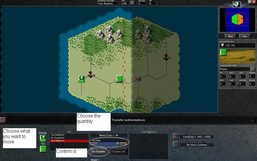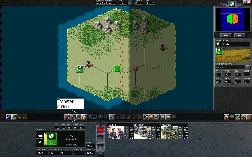 Next select our new formation and you will be able to select units in the HQ that you want moved to our front line formation. We choose to move rifle units. How many? Let's move all 16. Click the transfer button and all 16 should move from the HQ to Regiment 2. Don't press the “Transfer” confirmation box until you are certain about the number you want to send. Hit the returning arrow button (far left on the line of buttons) to return to the previous interface.