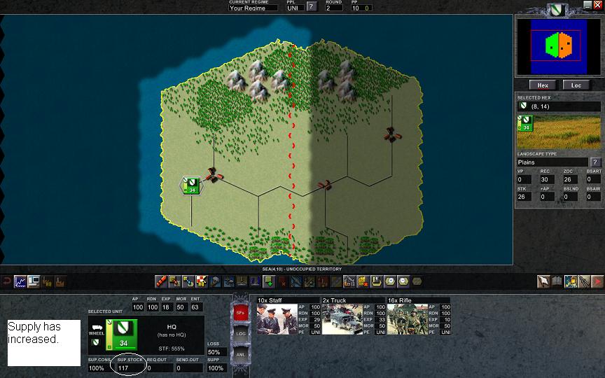 After the computer does some work, click “start”. Choose your HQ unit. Notice that 16 infantry units have arrived and that your available supplies have increased (in the previous screen the total was only 20). Also notice that in the previous screen, there is a red dot in the lower left corner of your HQ unit, while in the present screen, the light is green. Red means you have not received any new supply that turn (you are going to use your stored stock). Green means your stock of supply is increasing. If you run out of supply entirely, your units will starve.