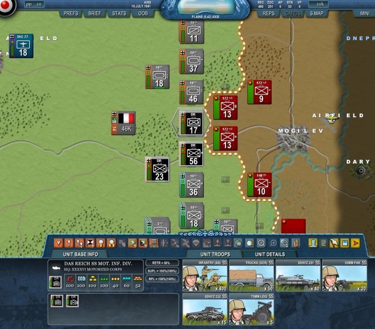 | Tags: ww2, Europe, Eastern Front (WWII) Description: This scenario covers the fighting around Smolensk during Operation Barbarossa from 10 July 1941 to 15 August 1941. This is edited version of Drive on Smolensk v1.02 by Lee “elmo3” Elmendorf http://www.vrdesigns.net/scenario.php?nr=233 Scenario contains files with detailed description what was changed. I liked version 1.02 but its author said that he does not plan to make any more updates to it at this point, so here are my updates to this fine scenario. Screenshot: Click for viewing full size ![]() Download: You cannot download scenarios if you are not logged in. |