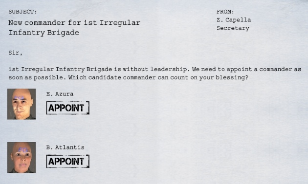 A relatively big part of Shadow Empire will consist of managing your leaders and making appointments. Here a newly formed Infantry Brigade needs a commander appointed. There are military positions like these, but also more administrative positions like council directors.