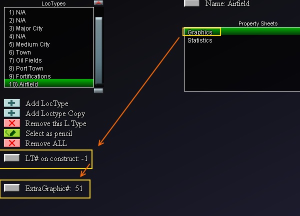 Now click the graphics tab and set the LT# on construct (Landscape Type #) to -1. This means when you place it on the map in the editor the current landscape type of the hex will not change. However we do want to give the user a visual cue and for this we set the ExtraGraphic to 51 (aircraft symbol).