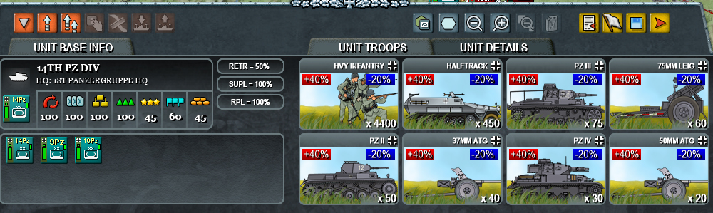 It’s about time we discussed the nitty gritty of Operational Command. The game’s basic unit is the division. They are grouped together in Armies, or Panzergruppes in the case of the fast divisions.