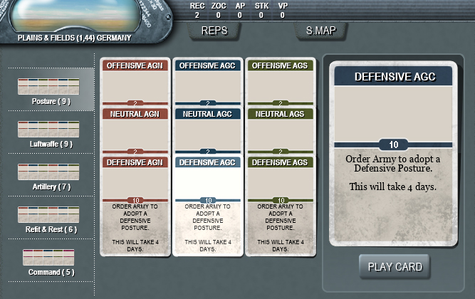 The cost of playing a posture card is an obvious constraint. The Germans start the campaign with the Defensive Posture card at five times the cost (in PP’s) of the others to reflect the ridiculous notion, at the time, of an Army switching over to the defence.