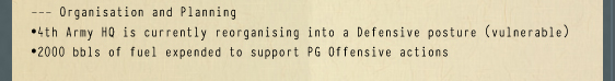 All good stuff that could feed into the Decision system. ‘Do you authorise the release of rehabilitation battalions?’ ‘Which theatre has priority for experienced replacement officers?’ ‘Are you willing to shorten the training cycle for NCO’s?’, etc.