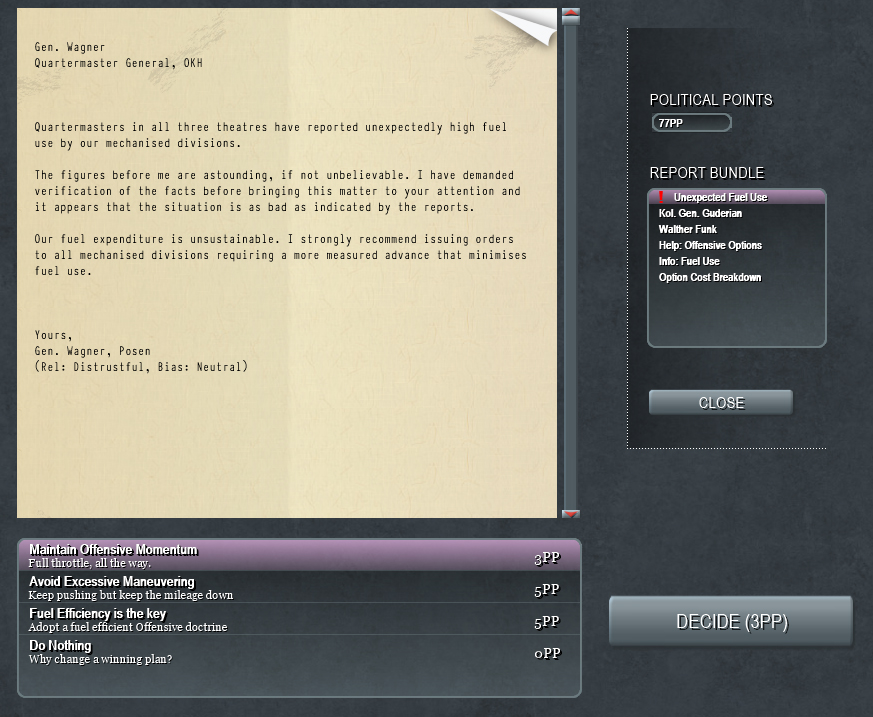 (On my list of outstanding Decisions, yet to be done, is something that revolves around the Führer’s willingness to confront the on ground reality of the later part of the campaign.) – I hesitate to pre-empt the choices that you may make, but strongly support the trend to give options, there may be an historical sequence to Fuehrer Directives, but this is one area where a change of policy might have created large differences in outcome.