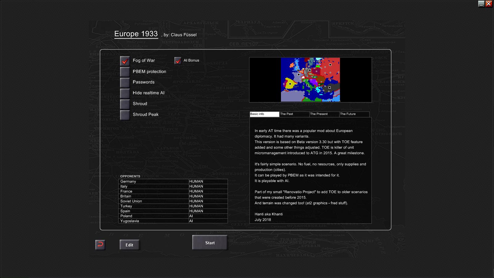 | Khanti | The original scenario \"Europe 1933\" also can be downloaded from scenario bank. It was made by ernieschwitz and was uploaded in 2011 as Beta version 3.30. My version is based on this one. | July 25th, 2018 |