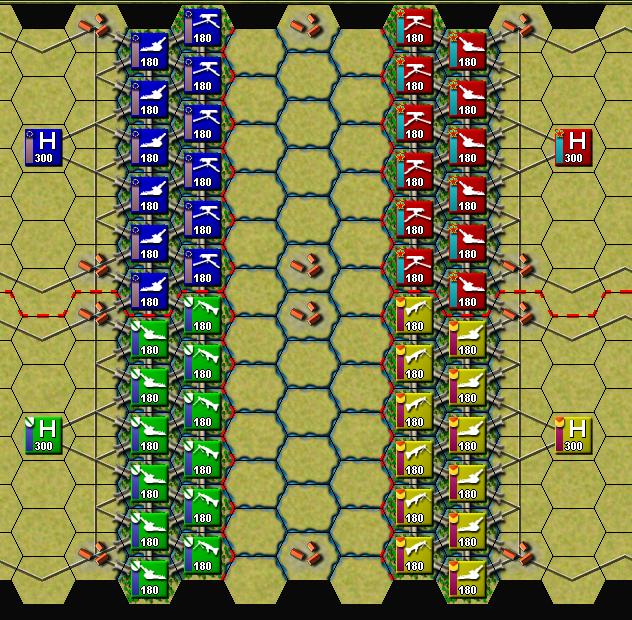 | Tags: needstag Description: This map was designed for two-on-two play and probably works best with human players. The Blue and Green players are on the West Team while the Red and Yellow players are on the East Team. You must capture at least three enemy victory points in order to win, or you may set some other goal. The central section is heavily fortified and full of streams of water. Streams are not as difficult to traverse as rivers but they will still make it very difficult to assault your enemy di Screenshot: Click for viewing full size ![]() Download: You cannot download scenarios if you are not logged in. |
