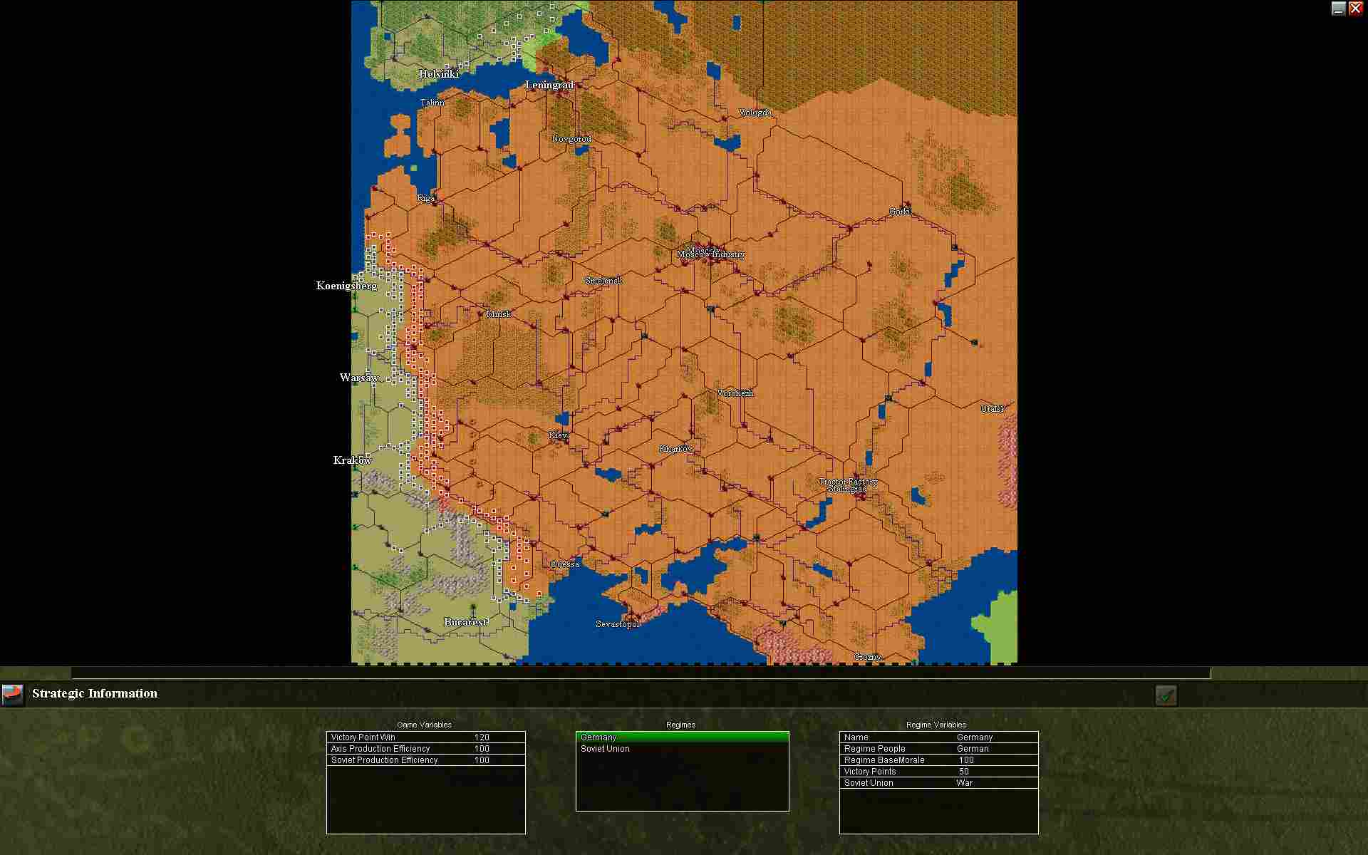 | Tags: ww2, operational Description: Download scenario and graphics from: http://www.filefront.com/14040789/OperationBarbarossa1407.zip Operation Barbarossa: This is a division-level representation of the East Front from June 22th, 1941 onwards. The map extends from Warsaw to Gorki and from Leningrad to Grozny. Scale is 12 miles for east / west hexes and 1 week per turn. Screenshot: Click for viewing full size ![]() Download: You cannot download scenarios if you are not logged in. |